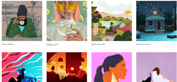 Right on the front page of their website, illustrators are showcased based on their art and style, making it easy to visualize projects.