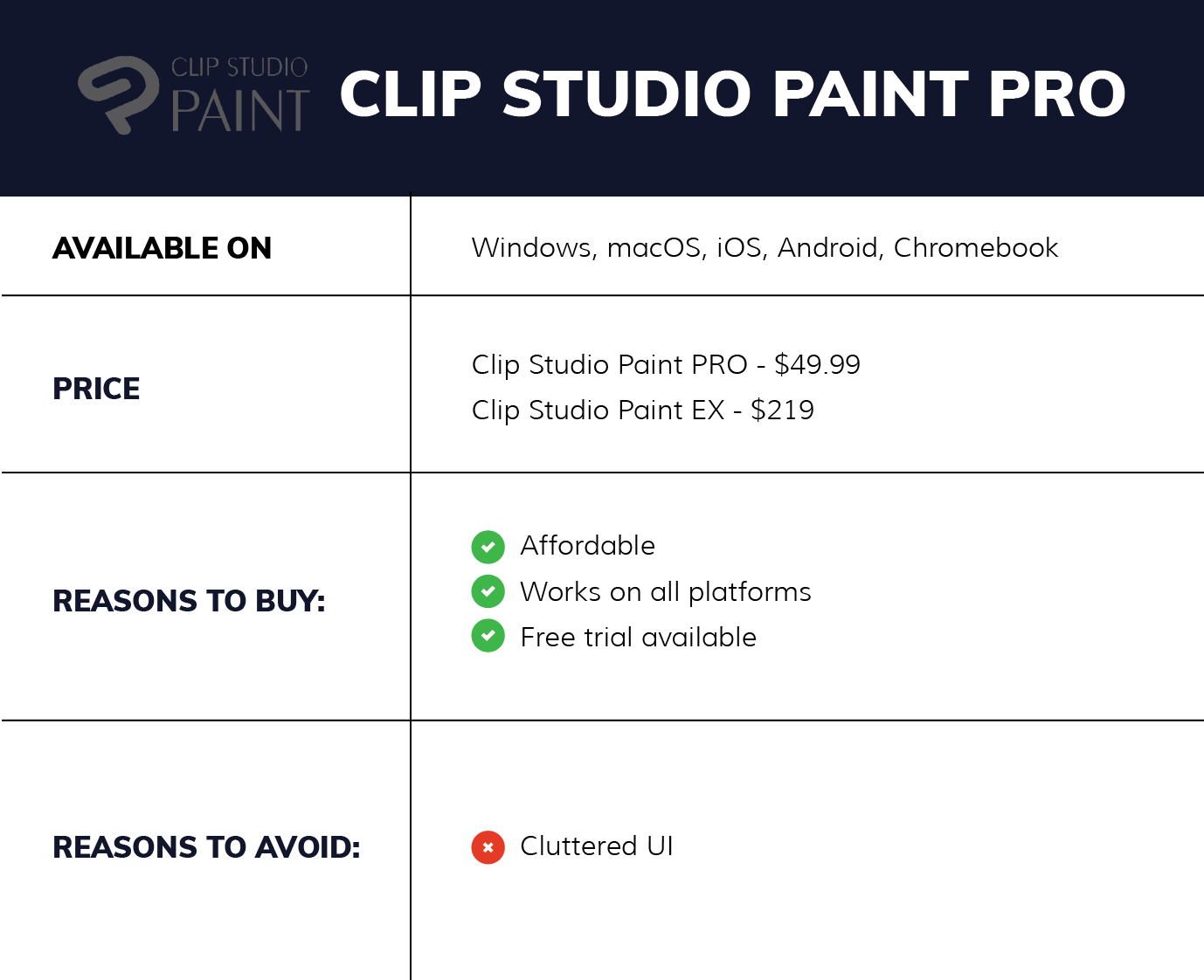 The Pro version suits single-page comics. Clip Studio Paint EX is suitable for motion graphics animation, multi-page projects, and specialized content creation.